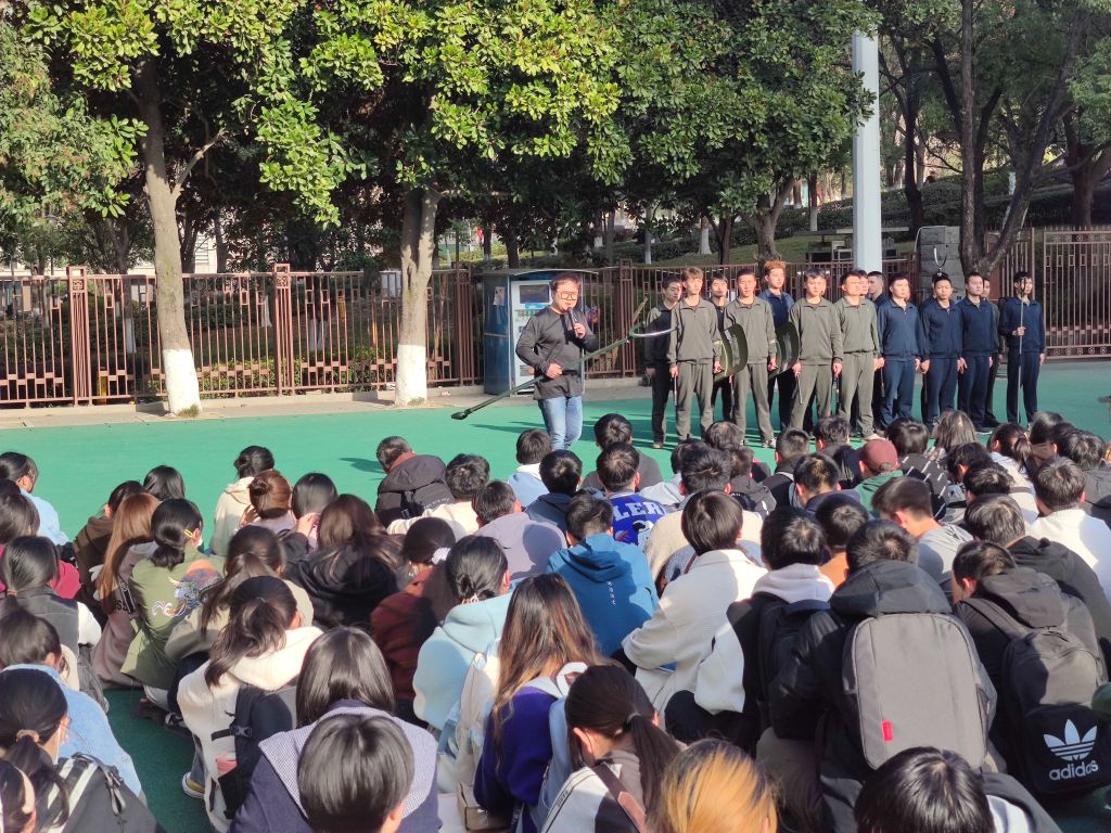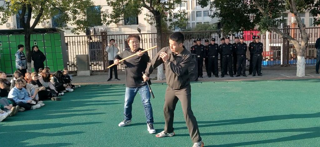 演练开始后,首先由校beat365官网治保队演示了警棍、警棍盾牌的基本使用方法。随后,校beat365官网马越老师针对可能出现的各种突发情况、防爆器材使用以及突发情况处置方法等方面进行了现场演示讲解。