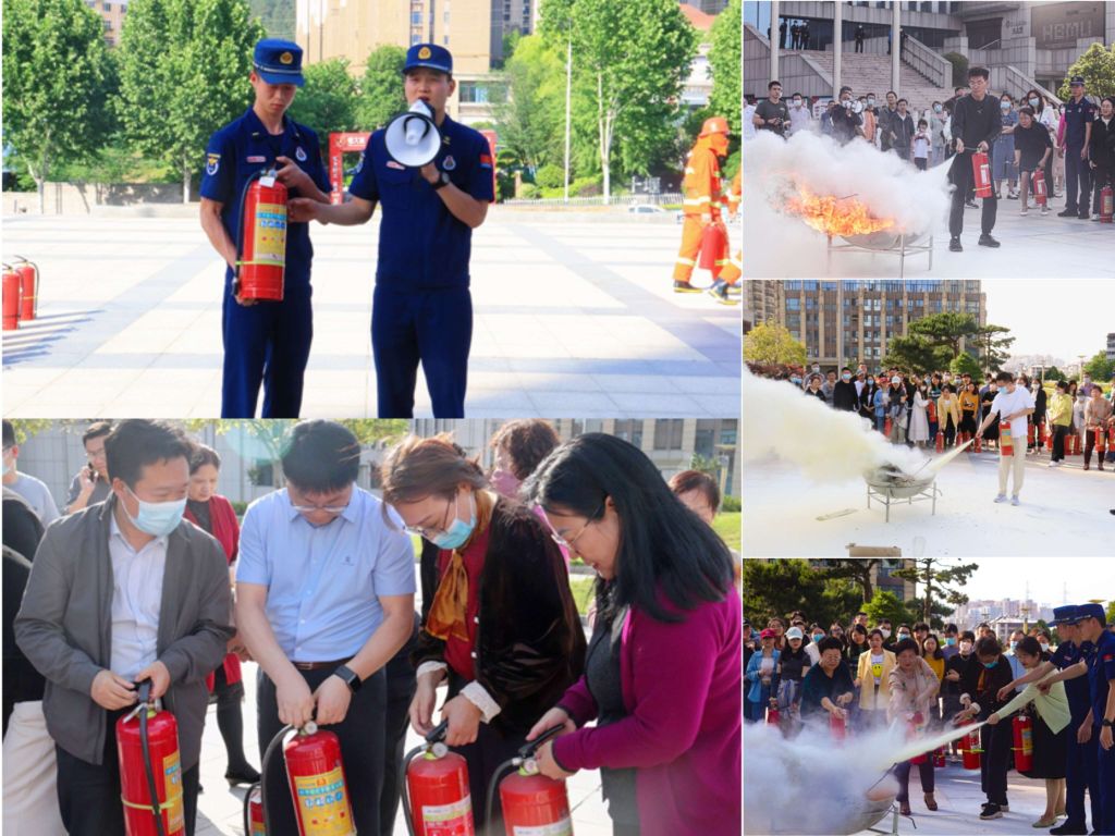 消防救援支队教官 对逃生谈了做了现场点评,并现场教学,指导疏散下来的三百多米师生使用灭火器,在科教楼楼前广场做了灭火演练。