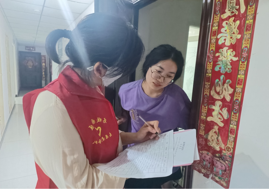 6月20日下午六时,志愿服务队到达北京小镇小区后,由社区活动负责警员讲解此次活动的要求和注意事项。志愿者们分组跟随社区工作人员,前往各自负责的区域开展入户调研反诈宣传。