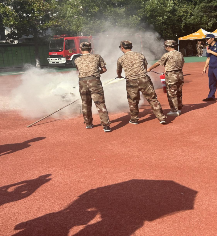 下午2时30分在学校足球场上,茅箭区消防大队的官兵们现场演示了灭火器的正确使用方法,并讲解了火灾初期扑救技巧及相关急救逃生知识,部分新生代表还在消防官兵的指导下亲身体验了灭火器扑灭明火的过程以及水带、水枪的使用方法。