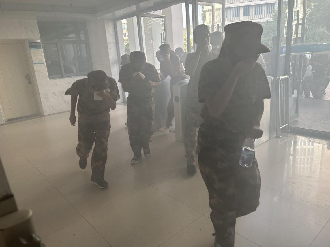 随后学生们来到汇城公寓,随着警报声骤然响起,消防逃生疏散演练正式拉开序幕,同学们在广播的提示下迅速用湿毛巾捂住口鼻,弯腰低身,按照预定逃生路线有序撤离。