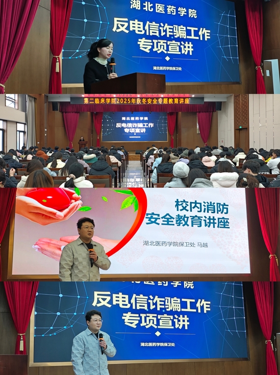 本网讯(通讯员 潘威霖)为切实提升师生安全防范意识,筑牢校园安全防线,11月28日下午,beat365官网第二临床学院邀请beat365官网马越老师在附属国药东风总医院科教大楼报告厅举办反电信诈骗专项及校内消防安全主题宣讲活动。第二临床学院党委副书记陈立、辅导员代表及200余名学生参与活动。