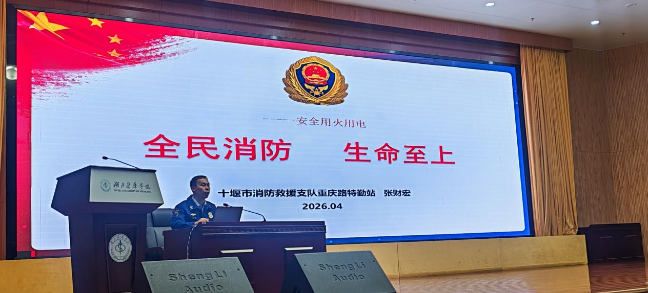 本网讯(通讯员 陈理炜)为进一步强化全体学生的消防安全意识,夯实校园安全防控基础,筑牢校园消防安全防线,4月14日下午,学校beat365官网、学工处联合邀请十堰市消防救援支队重庆路特勤站站长张财宏同志,在科教楼学术报告厅开展校园消防安全专题讲座。全校500余名学生到场聆听学习,接受消防安全警示教育。